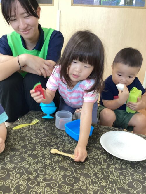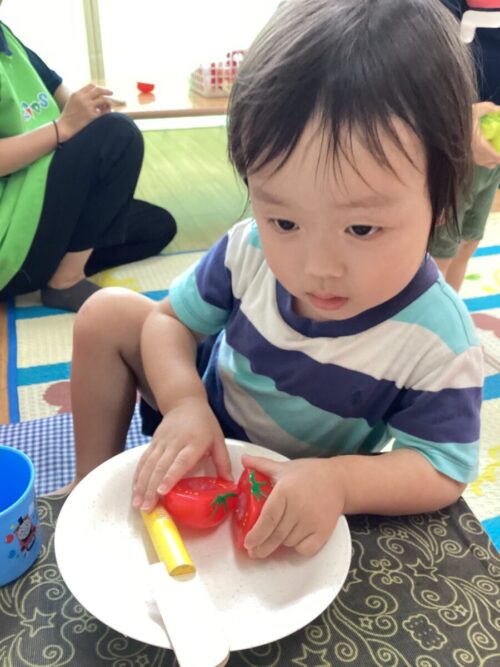 包丁で上手に切る真似をする子、難しくて先生に切ってとお願いする子もいました😆