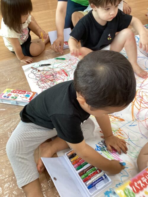 今日は床一面に模造紙を貼り付けてみんなでお絵かきをしました♪