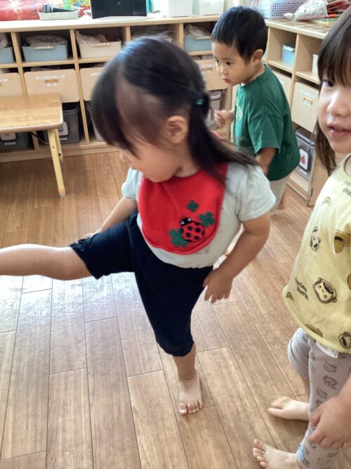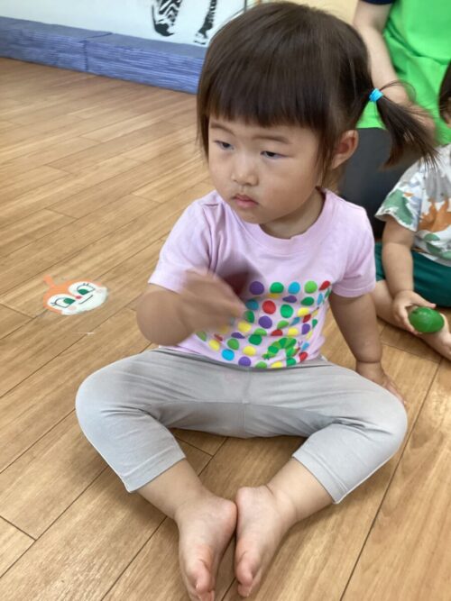 みんなとても上手に、ピアノに合わせて歩いたり、ユラユラしたり、頭をチョンチョンしたり、膝をトントンしたりして楽しんでいました♪