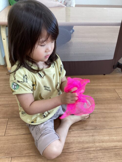 フワフワの布を水鉄砲に見立ててシュとしたり🔫