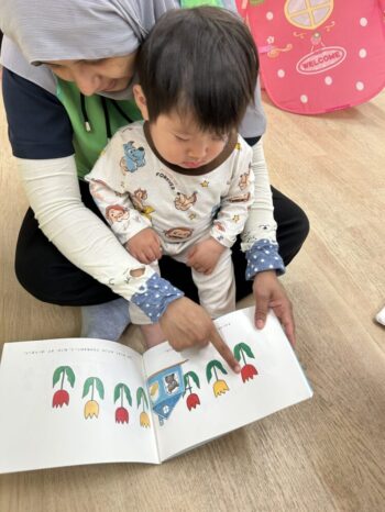 散歩から帰ったあとはくま組のお部屋にお引越しして見学会のスタートです✨初めてのことに緊張ぎみのあひる組さんでした🤭