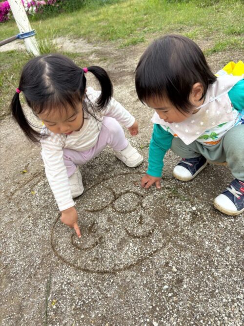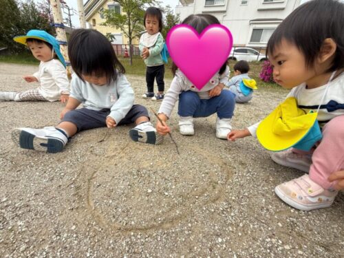 すべり台を満喫したあとは地面に座ってお絵描きタイムです🖼️木の枝を使って線や丸を上手に書いていましたよ👏