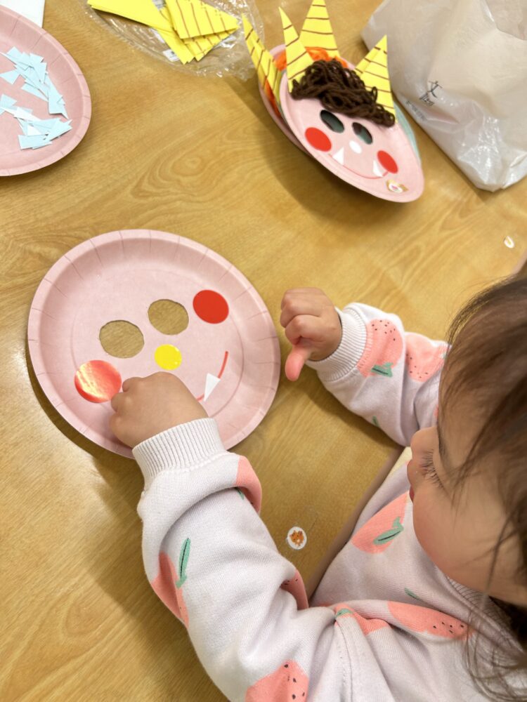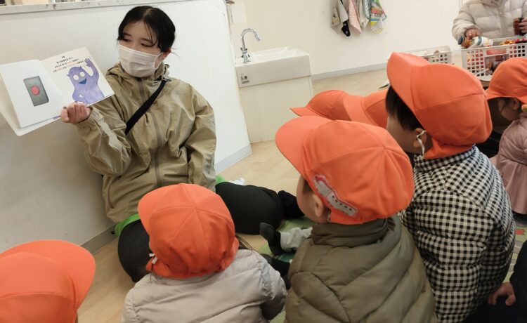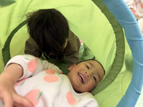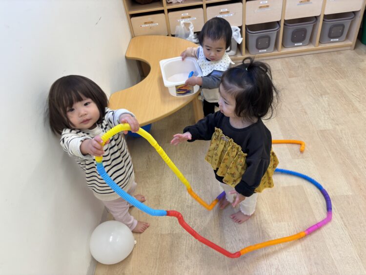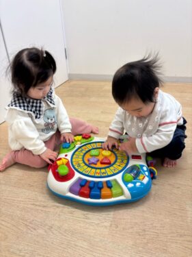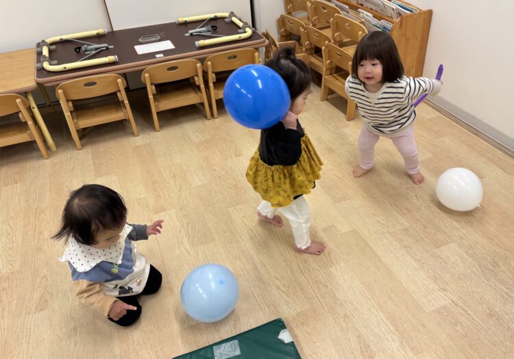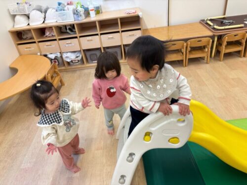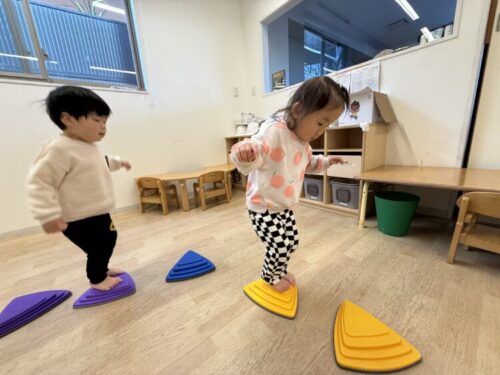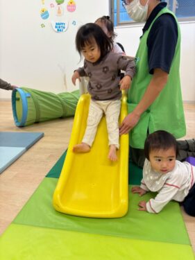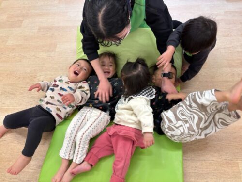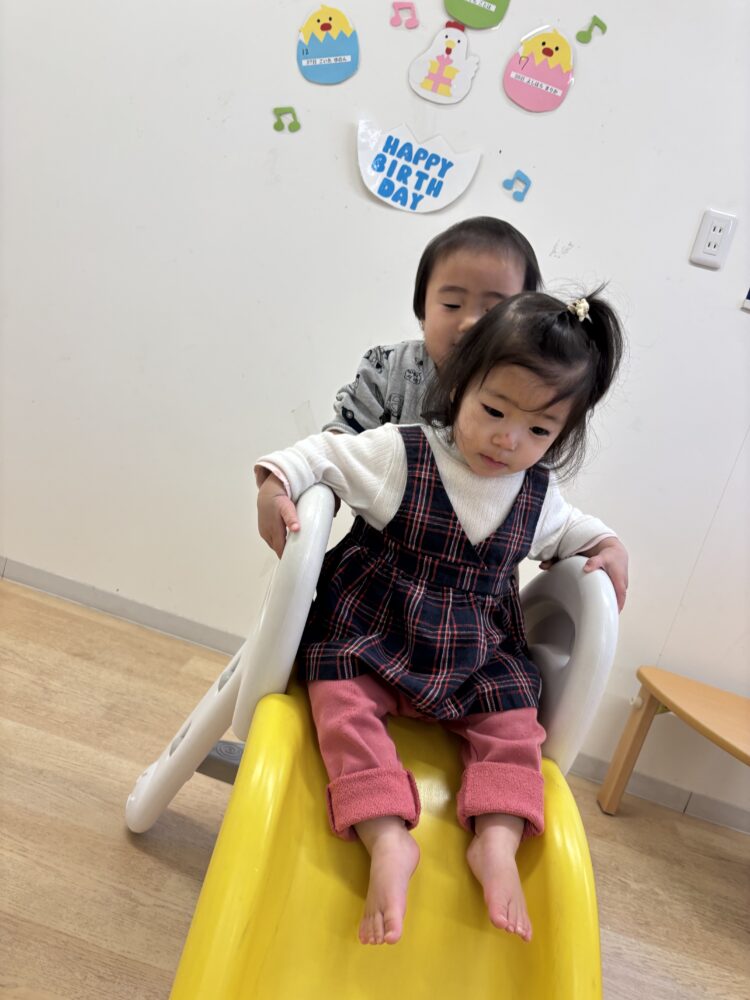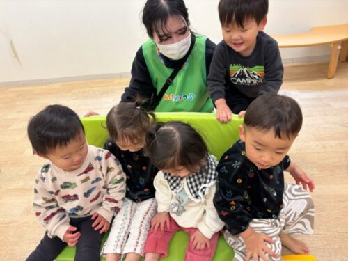 お留守番をしていたひよこ組さんに合流して室内遊びをしました💪折りたたみ式のマットにソファのように座るひよこ&あひる組🐣🦆