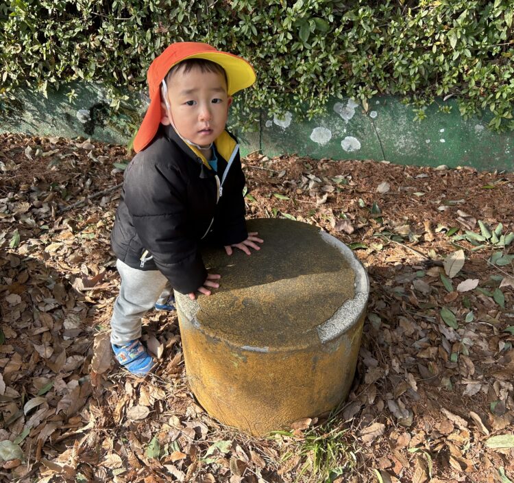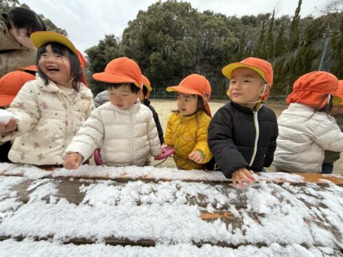 裏山広場に向かう途中、グラウンドのベンチにたくさんの雪が積もっていました❄️「触ってみる❓」と聞くと、「触るーー‼️」とニコニコでお返事するあひる組さん🦆