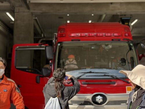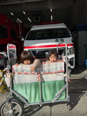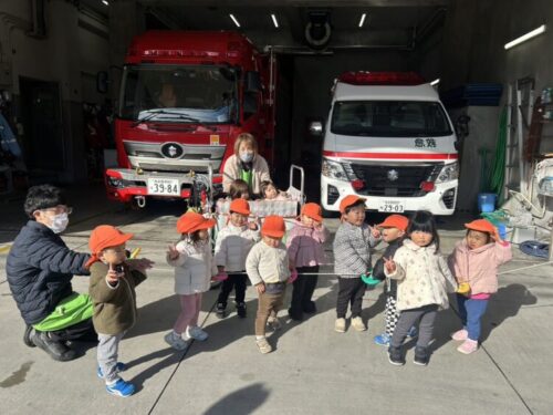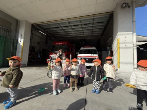 天白消防署植田出張所に到着しました🙌今日は消防車も救急車いました🚑🚒「どっちもいる‼️」と大興奮のひよこ&あひる組さん🐣🦆