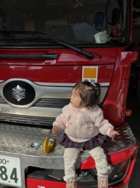 ひよこ組さんは消防車のフロント部分に座らせてもらいました✨ちょこんと座る姿がとてもかわいいです💕