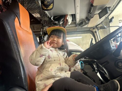消防車が大好きなあひる組さん🦆消防車の運転席でニコニコピースを見せてくれました✌️