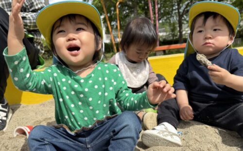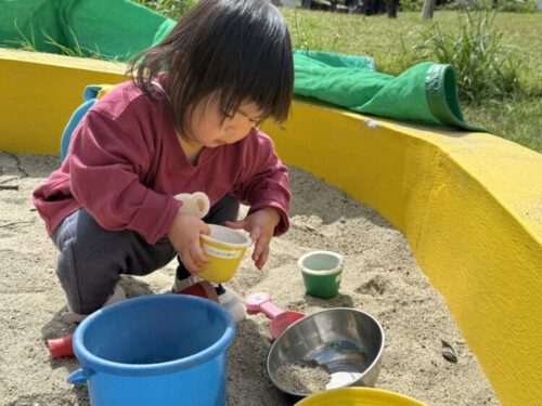 スコップですくったり、コップの中に入れてみたりと楽しく遊ぶあひる組さんたち手についてしまった砂を見て見て‼️と言わんばかりに保育者に自慢していました🤭