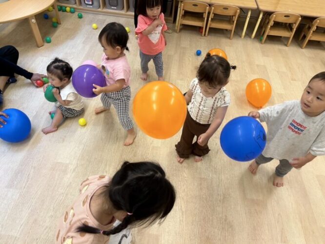 風船で遊んだよ! 「ふわふわーキャッチ!」風船にはアンパンマンが描かれていて、お友だちそれぞれのお気に入りを持って遊びました🎈