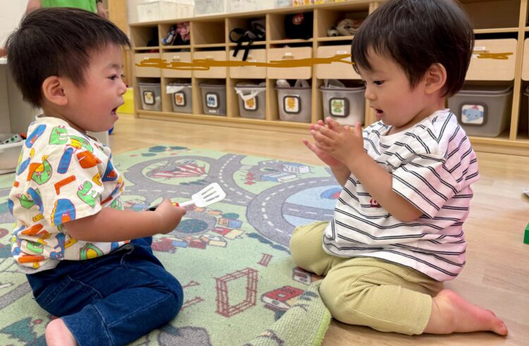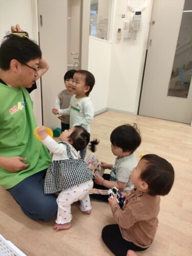 0歳のお友だちと1歳のお友だちが一緒に仲良く遊んでいましたよ