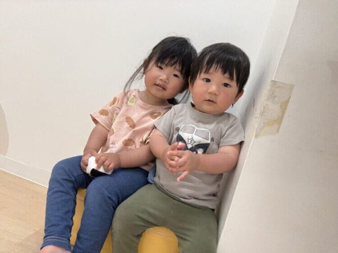 保育室に追加された椅子に仲良く座るお友だち🩷