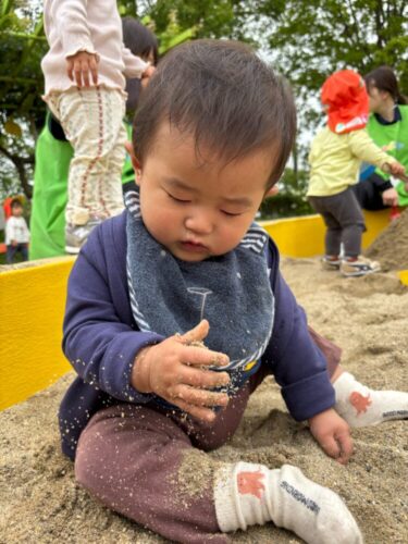砂場で砂の感触を楽しむお友だち