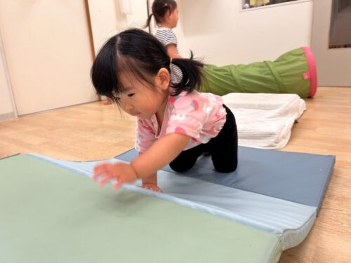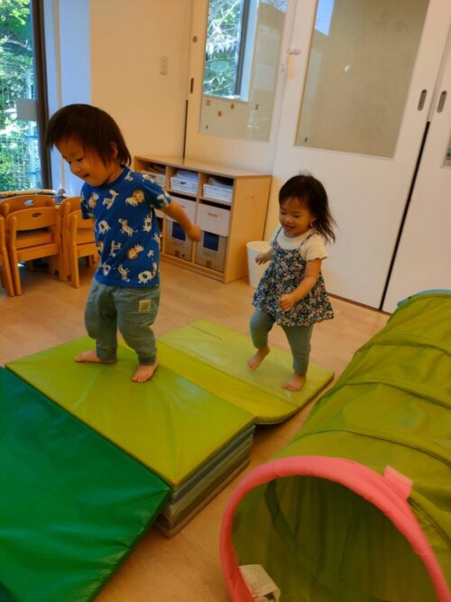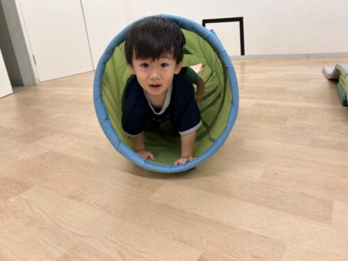 運動ルームでマットやトンネルを出して身体をたっぷり動かしました♪