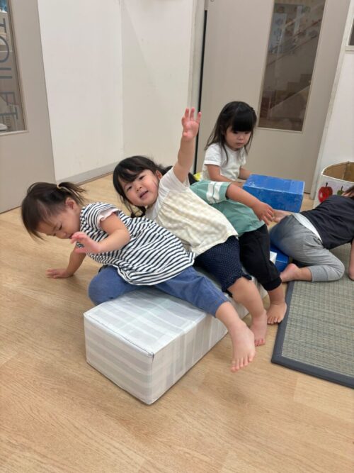 今日は午前中はあいにくの雨だったので、室内遊びをしました。