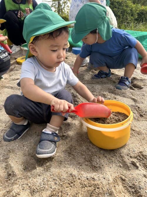 初めていく公園でバケツに砂を入れて楽しんでいましたよ