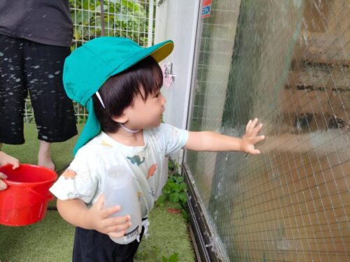 ホースで窓に水をかけ、水の膜が張ったところを不思議そうに触ってみるお友だち![]()