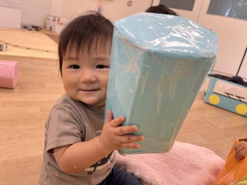 大きな玩具を持ち上げることができてとっても嬉しそうなお友だち![]()