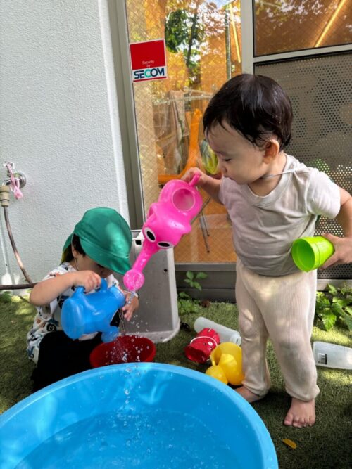 水遊びではお友だちと一緒にバケツの中をお水でいっぱいにしようとするお友だちがいました![]()