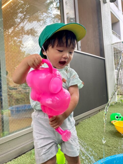 「ジャー💦」とゾウさんジョウロで楽しそうに遊ぶお友だち![]()