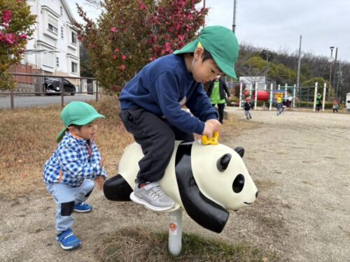 パンダ公園に到着です🐼ジョッキーのようにパンダのスイング遊具に乗ります🐎