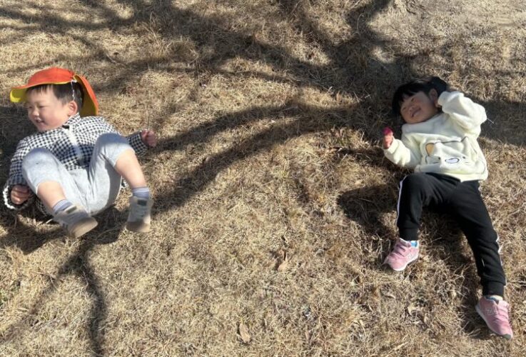 今日はパンダさん公園に行きました🐼お外は冷たい風🌬️がふいて寒さを感じても子どもたちは元気いっぱいです「上着脱ぐ〜」とみんな脱いで元気に動いていましたよ😊芝の上にゴローン😆おひさま☀️が当たるとポカポカだね☺️