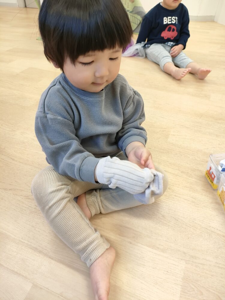 準備も自分でできるよ☺️靴下を履こうとがんばるお友だち🩷