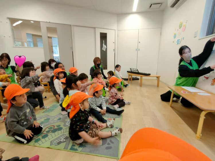 今日も元気に朝の会が始まりました😊アレレ?いつもの先生の場所にお友だち先生がいっぱい🥰みんなで👹のパンツうたうよ〜♪