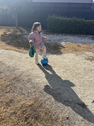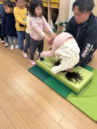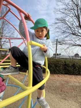 グローブジャングルジムもお気に入りの遊具の一つです👀「先生回してー‼️」と大きな声でお願いすると、「乗るまで待っててね‼️」と準備をします🏃♂️ばっちり位置が決まると「いいよ‼️」と元気に教えてくれます☺️
