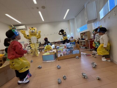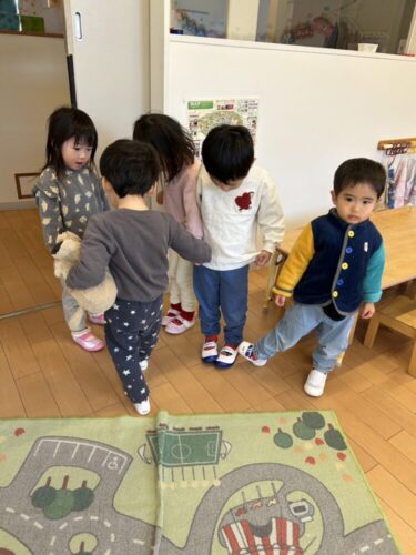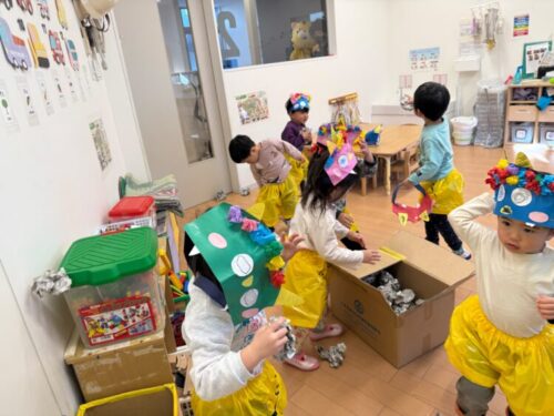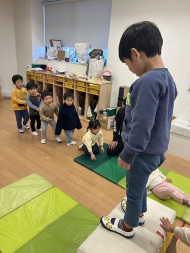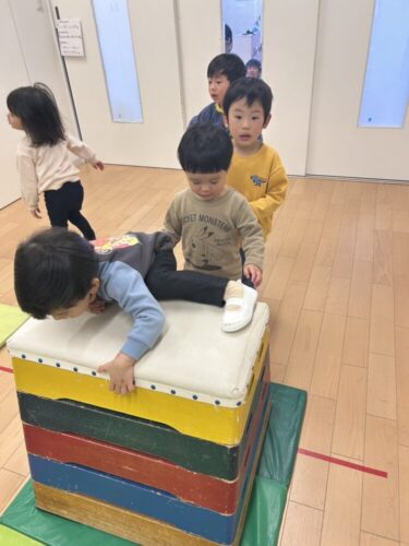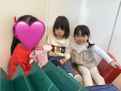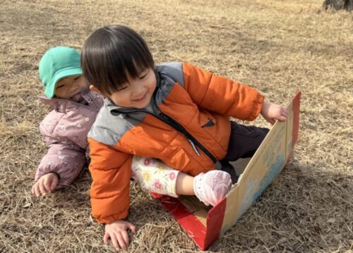「乗っていいよー‼️」とお友だちも誘って仲良くダンボール滑りをするうさぎ組さん🐰ゴロゴロと転がっていってもワハハと一緒に笑っていました😊