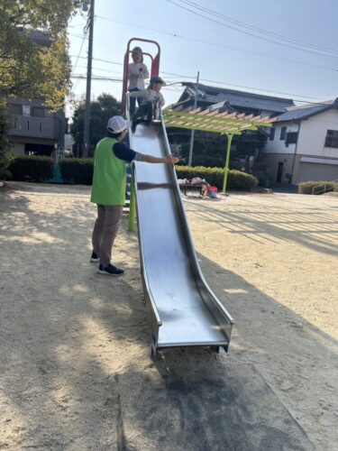 公園に到着すると、いつもの坂道に直行してダンボール滑りスタートです✨「一緒にすべろー‼️」とお友だちを誘って一緒に滑っていきます💪