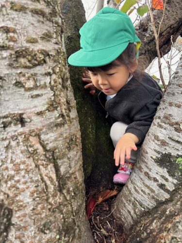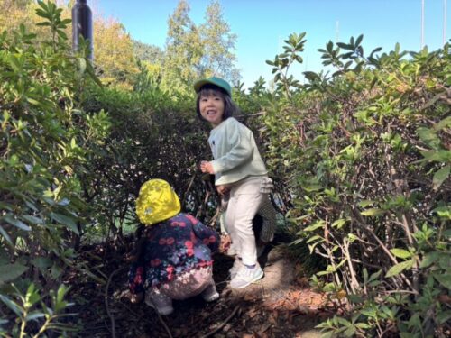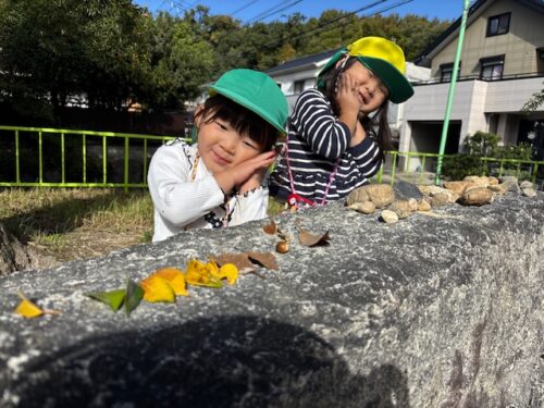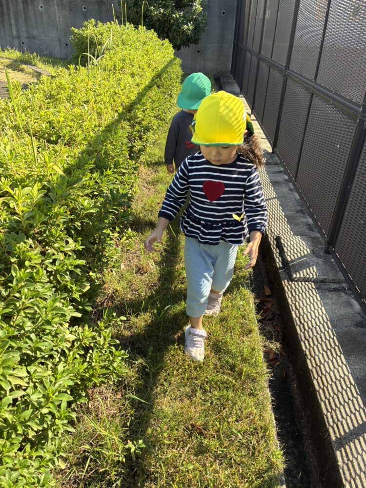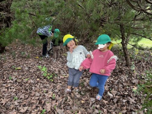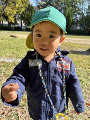 そのあとは、裏山広場へお散歩に行きました「変な虫いる!」と背中がオレンジのアリのような虫さんを見つけて大盛り上がり