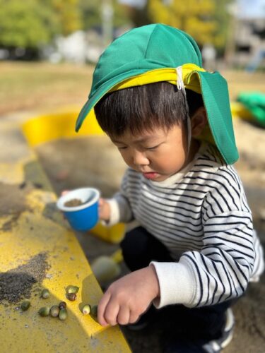 拾ったドングリをお砂遊びでトッピングに使ったり・・・
