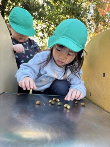 1個をコロコロ~と転がす子もいれば、たくさんのドングリを一気にまとめて転がしてみる子もいました