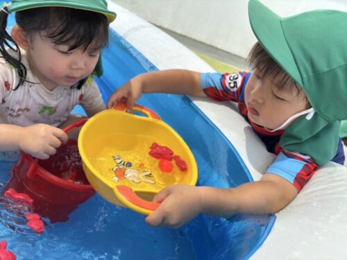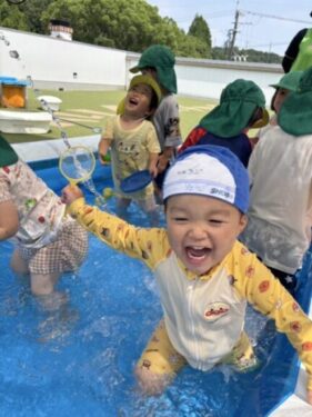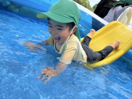 今日はすべり台を使ってウォータースライダーを作りました❗️バシャーンと水に飛び込むアトラクションに大興奮のうさぎ組🐰