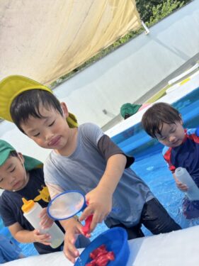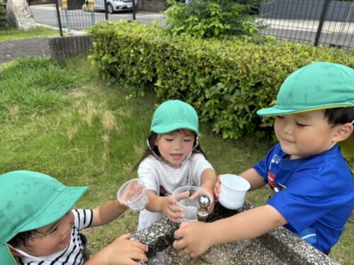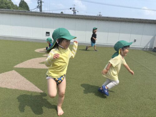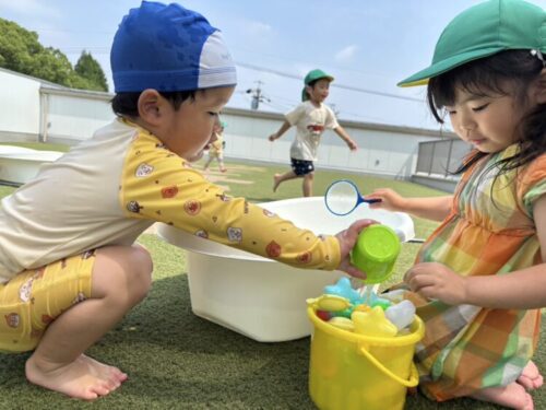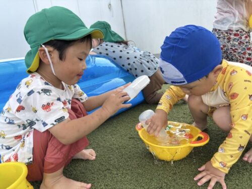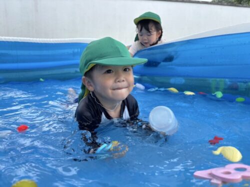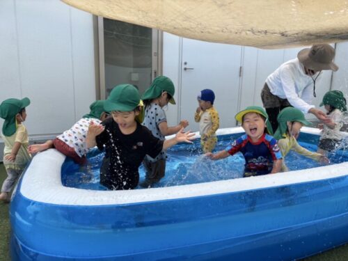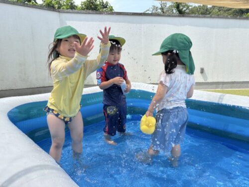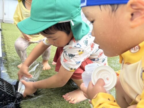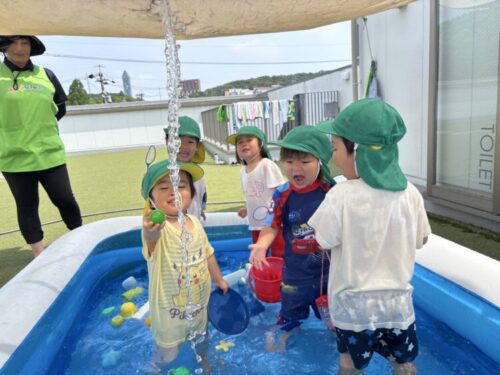 体操教室が終わった後は屋上で水遊び💧全身で水の感触を楽しみます😊
