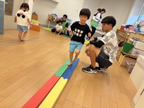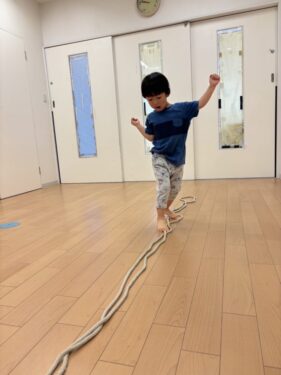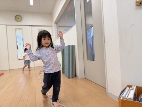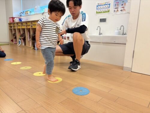 本日の体操教室は平均台の練習第二弾です。飛行機に変身して、カラフルな板から落ちないように慎重に進んでいきます👀