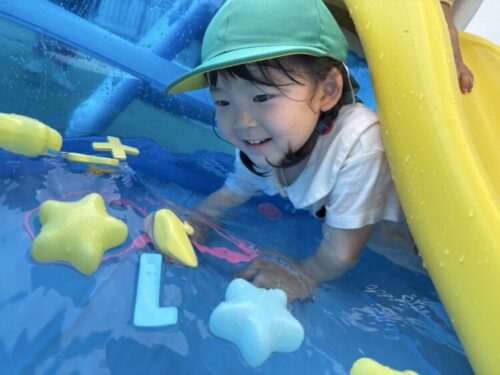 すべり台の下を潜るのも楽しい様子☺️上と下で仲良くウォータースライダーで遊んだうさぎ組でした🌈