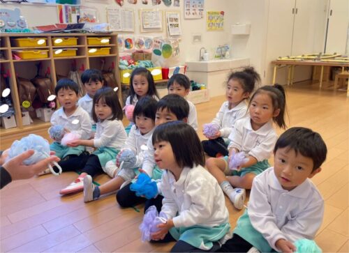 プレゼントの変わりのスポンジを先生からもらう時にきらきらなお目目が可愛らしかったです![]()