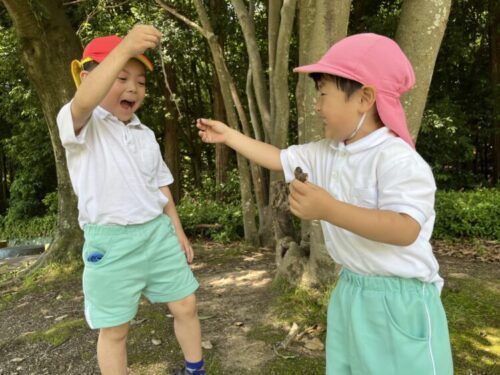 少し雨がおさまったので、一瞬テラスへ!ダンゴムシを見つけて大喜びのみんなでしたよ![]()