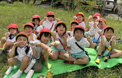 みんなでおにぎりを食べました☺️お外で食べる手作りおにぎりは、とってもおいしかったね🎶